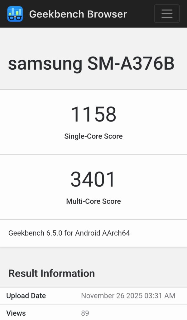 Dari hasil pengujian, Galaxy A37 mencatat skor 1.158 poin (single-core) dan 3.401 poin (multi-core). Angka ini menunjukkan peningkatan dibanding Galaxy A36 yang memakai Snapdragon 6 Gen 3, dengan skor masing-masing 1.007 dan 2.917 poin pada pengujian yang sama.