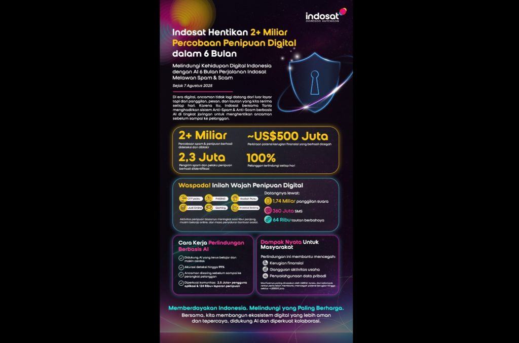 TEKNOBUZZ – Sejak enam bulan diluncurkan, fitur Anti-Spam dan Anti-Scam Indosat Ooredoo Hutchison (Indosat atau IOH) berhasil mendeteksi lebih dari 2 miliar panggilan, pesan, dan tautan berisiko spam serta scam. Berbasis kecerdasan artifisial (AI) dan dikembangkan bersama mitra teknologi strategis, Tanla lewat platform berbasis AI-nya, Wisely AI, sistem ini secara konsisten melindungi 100% pelanggan dari potensi penipuan digital.